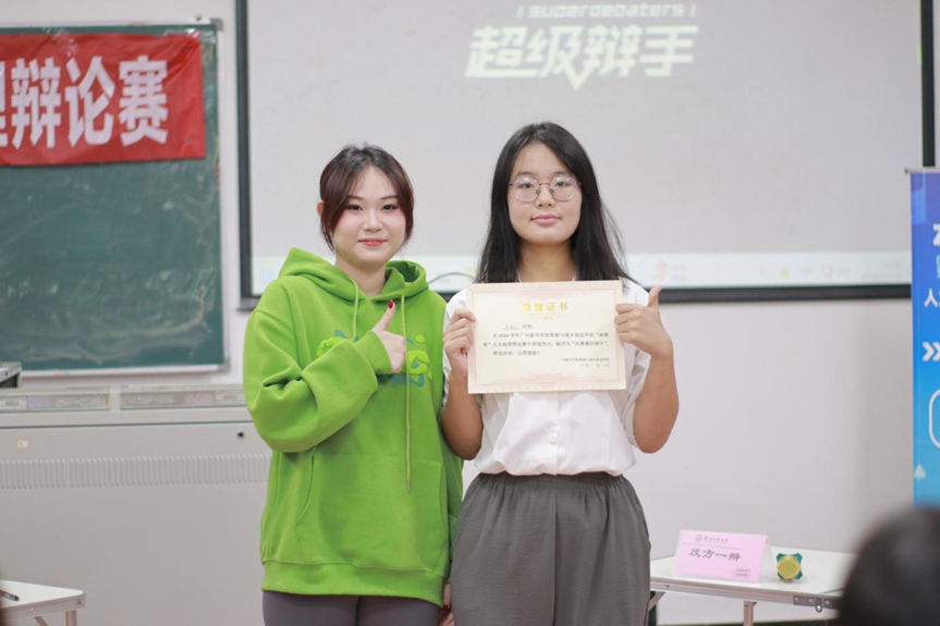 唐玮教练为最佳辩手:正方四辩——黄靖怡同学颁奖。