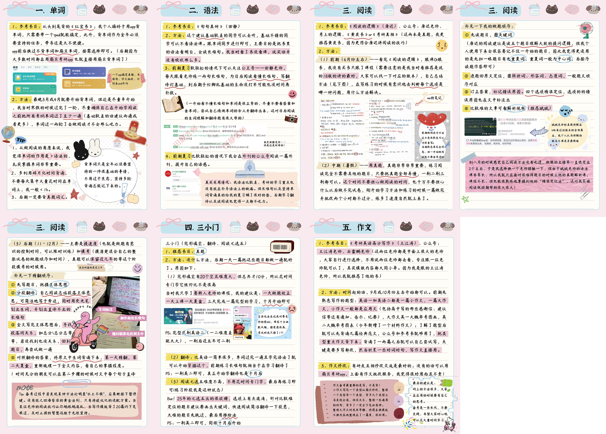 阅读——利用好真题非常重要,在刷题前建议单词过1-2轮。6月份前可以观看一些老师的阅读方法,打下基础后暑假可以开始练题,暑假时期我每天不限时且只做一篇,后精读理解确保吃透真题。后期复习重心也都集中在真题的反复多做多理解上。