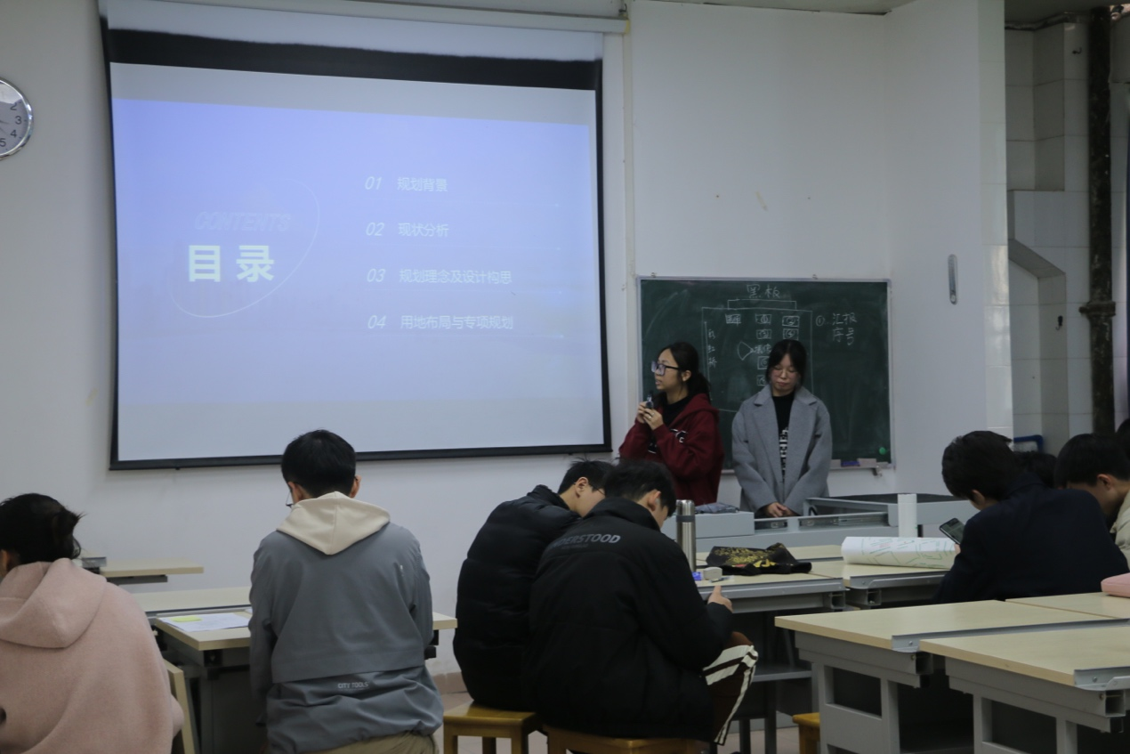 首先,各学生小组依次进行了课程设计成果汇报,内容涵盖规划理念与构思、功能结构设计、公共服务设施布局、道路交通规划等。学生们将课程所学内容融入具体实践,通过图文并茂的方式展现出各自小组的集体智慧与创意思考,充分体现出规划专业学生的综合分析能力与方案表达能力。